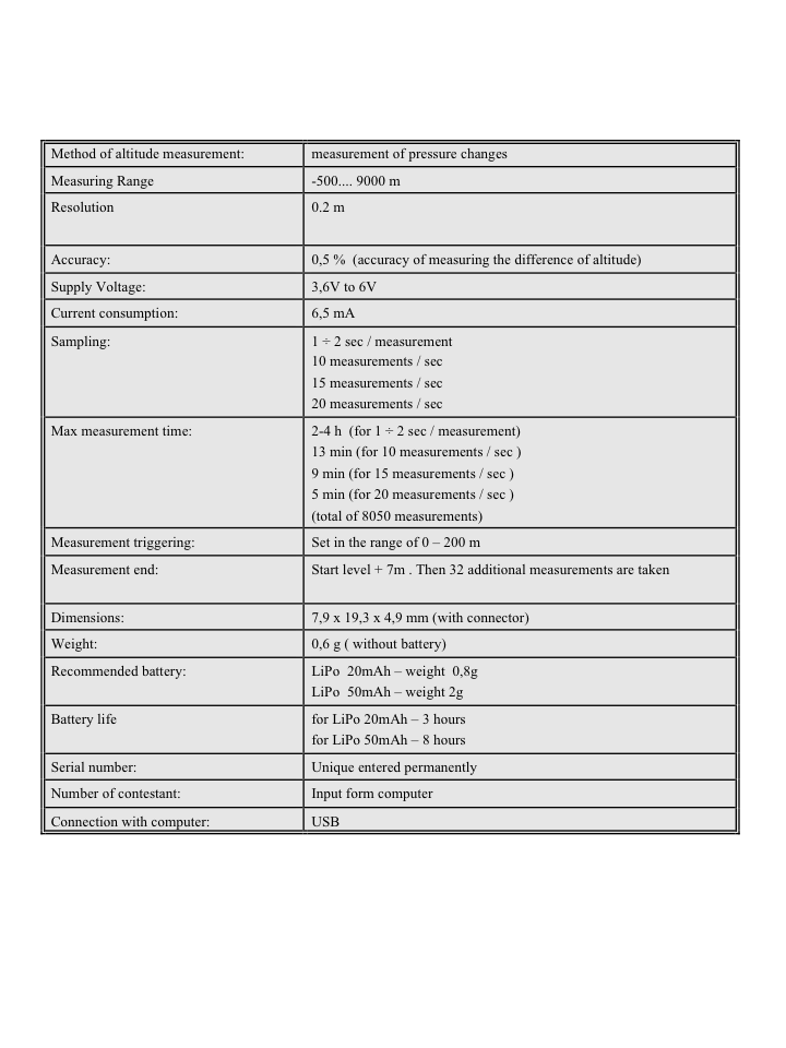 The Adrel data conversion program reads the pressure data from altimeter pressure sensor and converts it to altitude. The conversion is based on an NAR and FAI approved formula, which takes into account the current pressure, pressure changes, temperature, vertical temperature gradient, change of the density of the atmosphere, depending on altitude. Measurements are stored in nonvolatile memory, so they are saved when device is disconnected from power. Altitudes measurements can be sampled from 20 measurements per second to 1 measurement every 2 seconds (which can be useful for airplane applications where sampling speed is not as critical).
