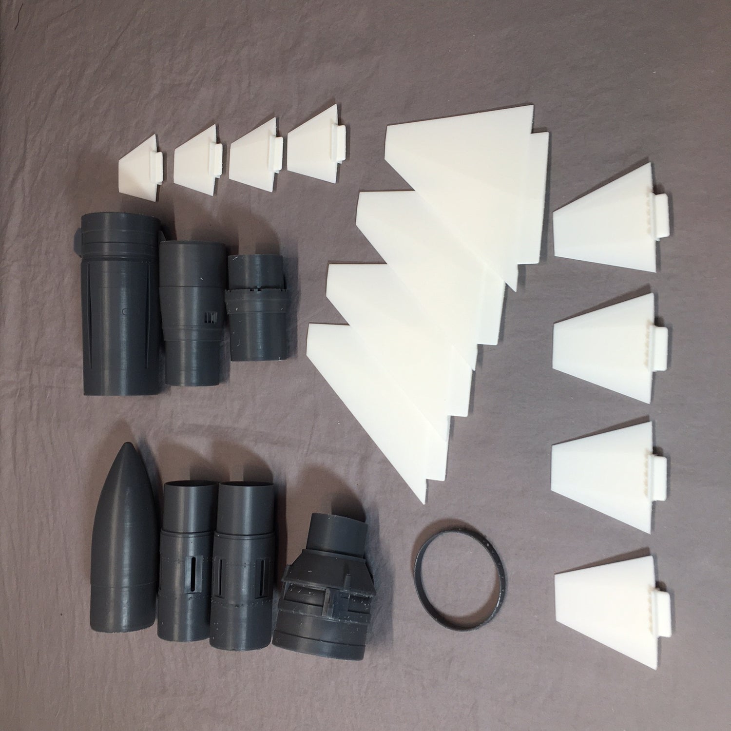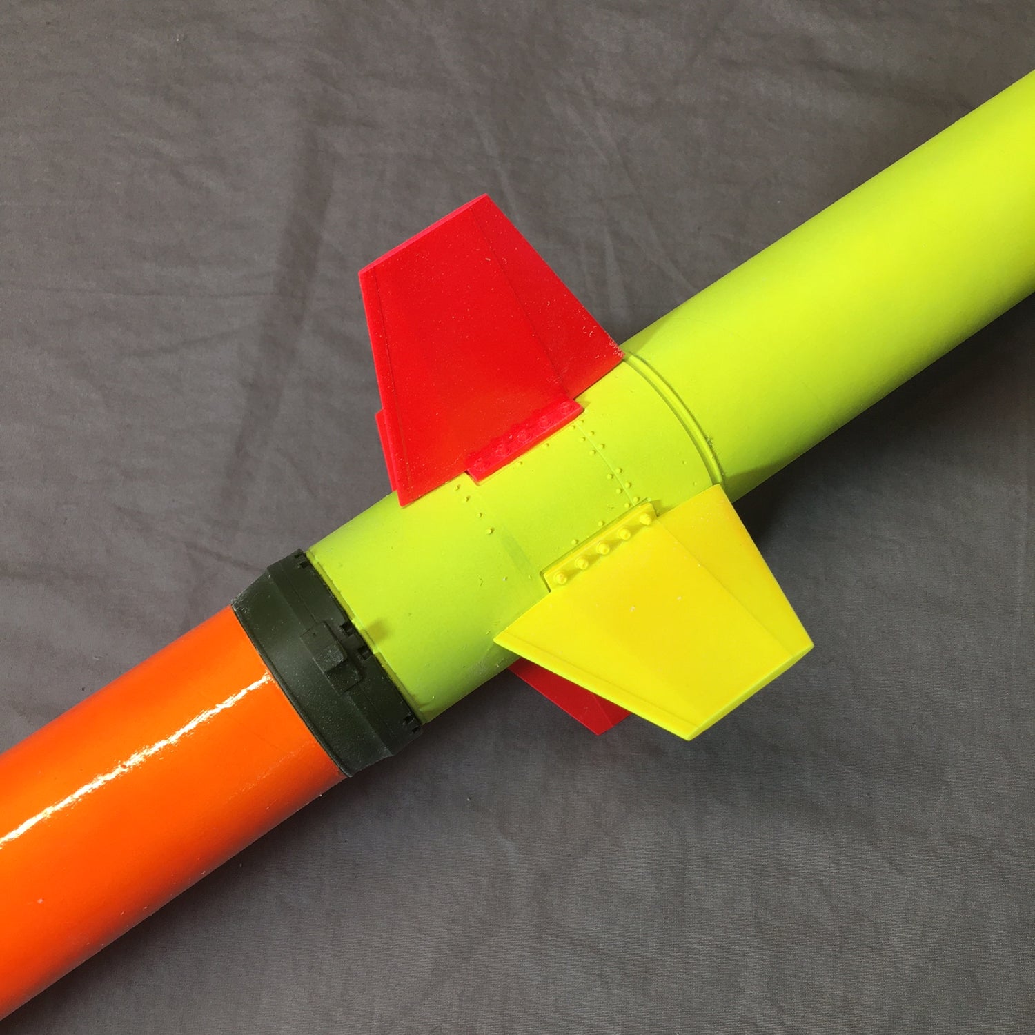 Over four years of work went into the development of the kit, which makes extensive use of commercial grade sterolithographic 3D printed parts. The 12 fins, 3 fin cans, 3 interstages, and nose cone are all 3D printed, allowing for quick and easy assembly without sacrificing detail. The fit and finish of the parts is exceptional, and the use of a toughened resin for the parts means they resist flight damage. The surfaces are similar to injection molded plastic parts, requiring minimal surface prep. Most of the working completing the kit involves finishing the tubes and painting! Assembly is also designed to eliminate the need for any paint masking, making it easy to have a good looking model.
