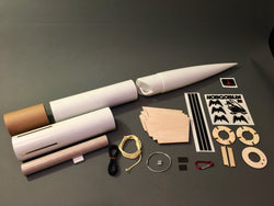 The kit is 2.64" in diameter, 34" long, and weighs 13.5 ounces (without the parachute). Suggested engines are E16-4, F15-4, F25-6, F50-6, G40-10, and G80-10.