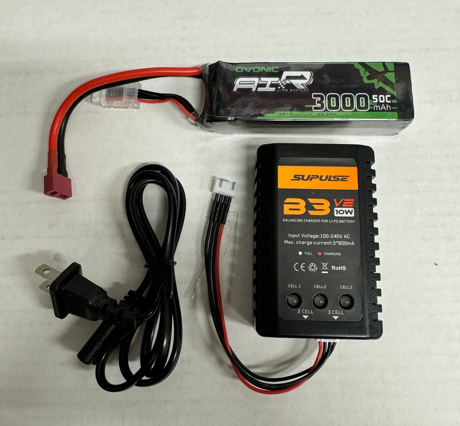 - Material: Lithium polymer, Voltage: 11.1V, Cell: 3S, Capacity: 3000mAh, Discharge: 50C, Charging plug: JST-XHR-4P, Discharging plug: Dean-Style T connector, Pack: Soft case
