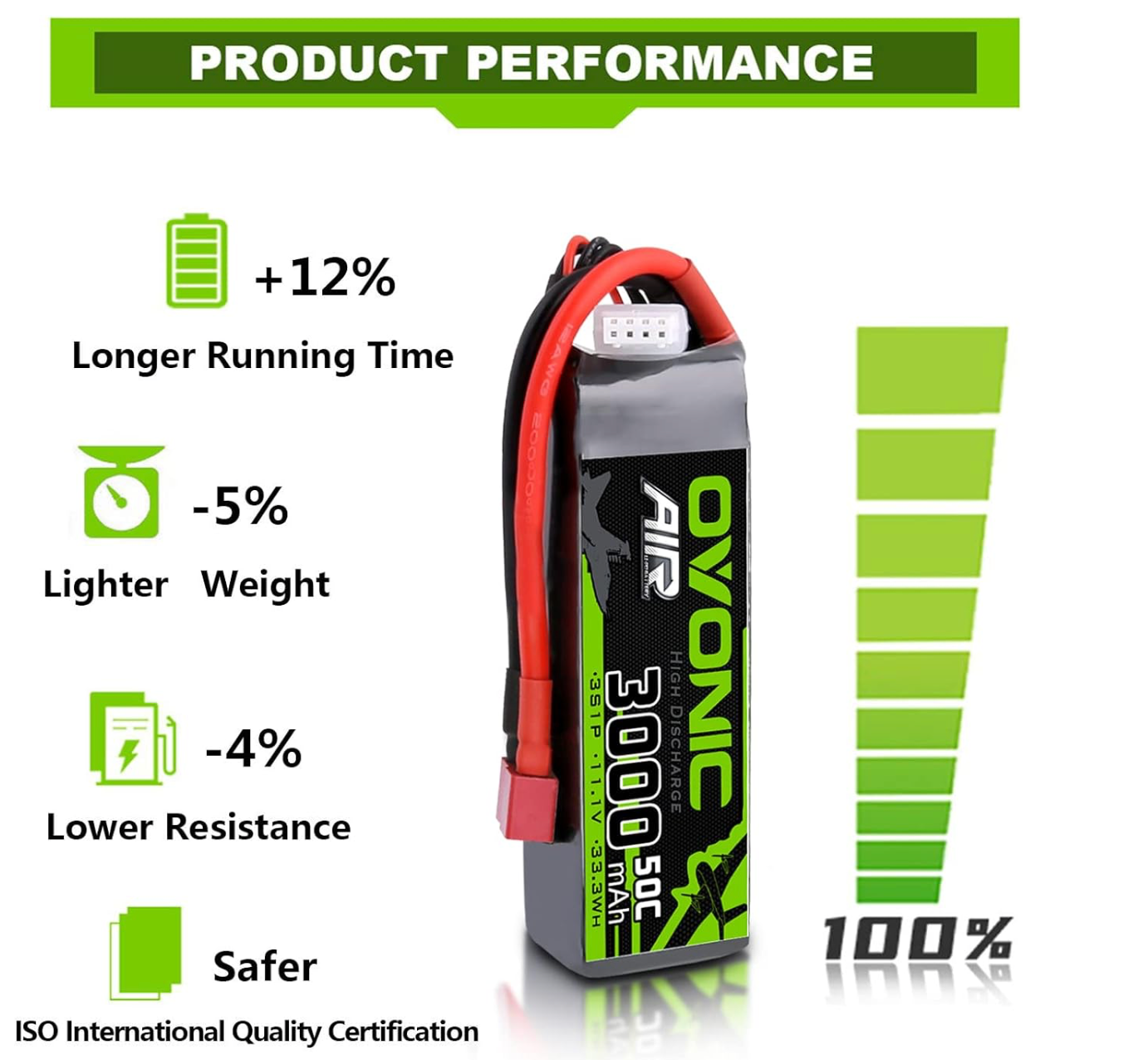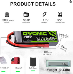 - Ovonic 3000mAh 11.1V Lipo Battery Dimension(±3mm): 105*32*28mm /4.13*1.26*1.1inch(L*W*H), Approx Weight(±5g): 193g /0.42lb